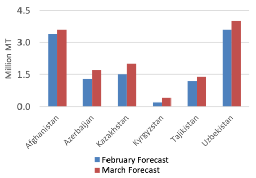 Учитывая обильные поставки как из Казахстана, так и из России, импорт для Афганистана, Азербайджана, Кыргызстана, Таджикистана и Узбекистана в этом месяце пересмотрен в сторону увеличения. 2022/23 Импорт пшеницы в Казахстан также прогнозируется в этом месяце до 2,0 млн тонн с учетом дополнительной приграничной торговли с Россией.