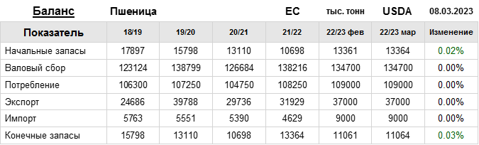 За прошедший месяц министерство сельского хозяйства США (USDA) на 08.03.2023 пересмотрело Баланс пшеницы для ЕС в сезоне 22/23 следующим образом: