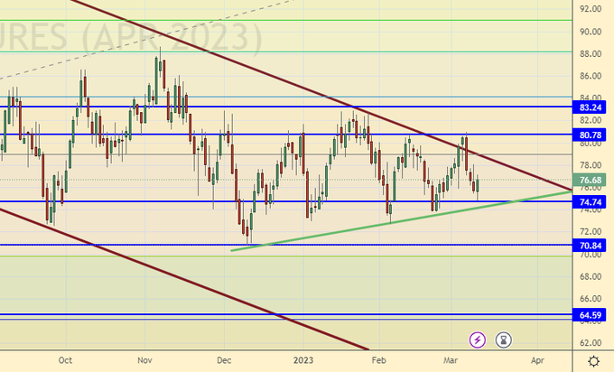 Сценарий роста: рассматриваем апрельский фьючерс, дата экспирации 21 марта. Если цены вырастут выше 81.50 откроем лонг. Пока остаемся вне рынка.
