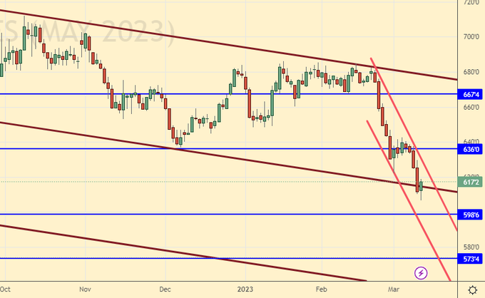 Сценарий роста: евро может подняться в четверг к 1.0800, но выше не пойдет, так как 22-го марта будет заседание ФРС, на котором ставка также как и в Европе будет поднята на 0.5%. Для хорошего входа в лонг хочется увидеть уровень 1.0100.
