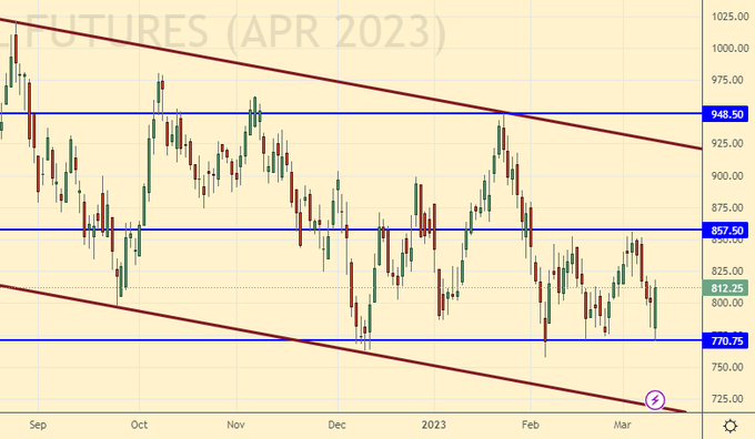 Growth scenario: consider the May futures, the expiration date is May 12. The current area is interesting for shopping. The bulls have two months before the May USDA report in order to lift the market by 10%.