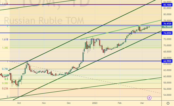 From what is happening in the foreign exchange market breathes longing. The ruble cannot strengthen against the dollar at least by 72.50. It stands near the local maximum at 76.50 and tends to further weakening. Marks at the top: 80, 84 and 88 rubles per dollar. Note that the rise in oil prices may not provide significant support to the ruble due to sanctions.
