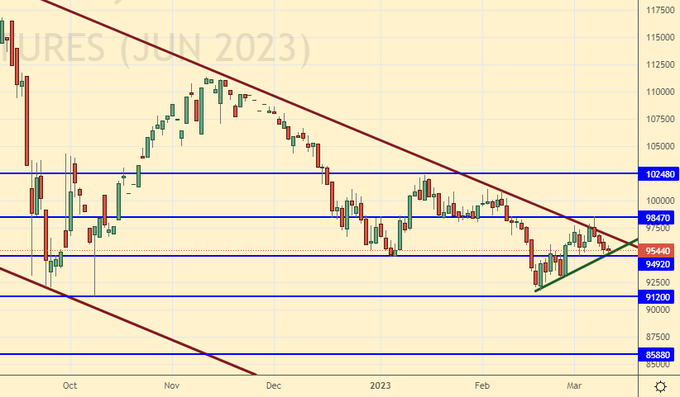 Growth scenario: we are considering the June futures, the expiration date is June 15. There were no significant changes in the market during the week. We continue to remain in the falling channel. While we are below the level of 100,000 we will not buy.