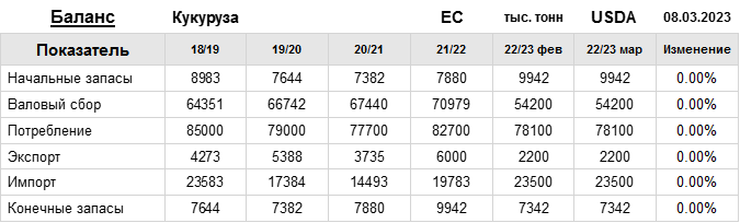 За прошедший месяц министерство сельского хозяйства США (USDA) на 08.03.2023 пересмотрело Баланс кукурузы для ЕС в сезоне 22/23 следующим образом: