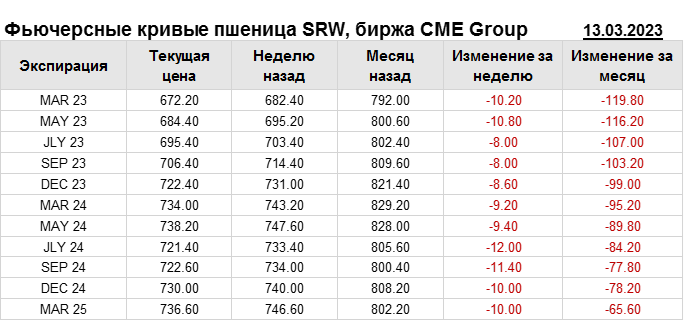 На 13.03.2023 стоимость пшеницы SRW на бирже CME Group по контракту MAR 23 составила 672.2 цента за бушель. За прошедшую неделю стоимость пшеницы SRW упала на 10.2 цента/бушель. Как мы видим на графике, фьючерсная кривая имеет периоды, когда более дальний фьючерс дешевле ближнего. Состояние бэквардации наблюдаем на следующих контрактах: JLY 24. Таким образом, трейдеры предполагают, что возможно превалирование предложения над спросом в указанные периоды.