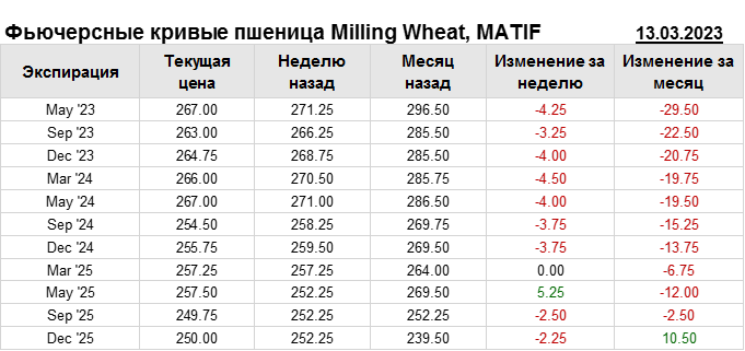 На 13.03.2023 стоимость пшеницы Milling Wheat на бирже MATIF по контракту May ’23 составила 267 евро за тонну. За прошедшую неделю стоимость пшеницы Milling Wheat упала на 4.25 евро/тонна. Как мы видим на графике, фьючерсная кривая имеет периоды, когда более дальний фьючерс дешевле ближнего. Состояние бэквардации наблюдаем на следующих контрактах: Sep ’23; Sep ’24; Sep ’25. Таким образом, трейдеры предполагают, что возможно превалирование предложения над спросом в указанные периоды.