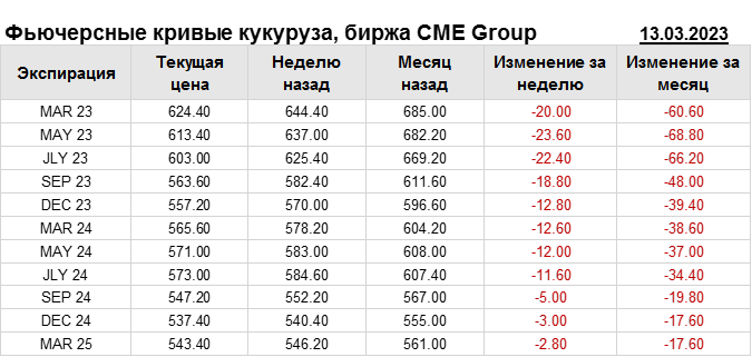 На 13.03.2023 стоимость кукурузы на бирже CME Group по контракту MAR 23 составила 624.4 центов за бушель. За прошедшую неделю стоимость кукурузы на площадке CME Group упала на 20 центов/бушель. Как мы видим на графике, фьючерсная кривая имеет периоды, когда более дальний фьючерс дешевле ближнего. Состояние бэквардации наблюдаем на следующих контрактах: MAY 23; JLY 23; SEP 23; DEC 23; SEP 24; DEC 24. Таким образом, трейдеры предполагают, что возможно превалирование предложения над спросом в указанные периоды.