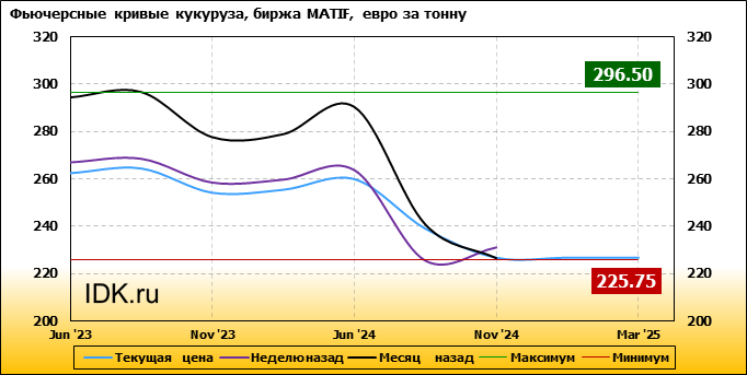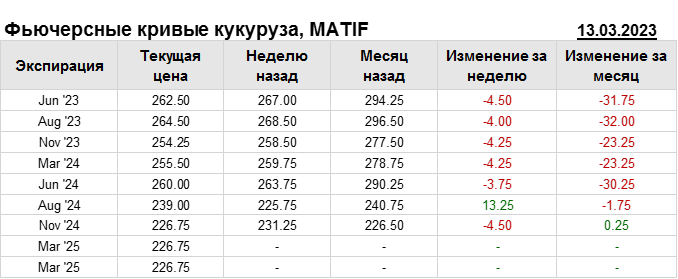 На 13.03.2023 стоимость кукурузы на бирже MATIF по контракту Jun ’23 составила 262.5 евро за тонну. За прошедшую неделю стоимость кукурузы на европейской площадке упала на 4.5 евро/тонна. Как мы видим на графике, фьючерсная кривая имеет периоды, когда более дальний фьючерс дешевле ближнего. Состояние бэквардации наблюдаем на следующих контрактах: Nov ’23; Aug ’24; Nov ’24. Таким образом, трейдеры предполагают, что возможно превалирование предложения над спросом в указанные периоды.