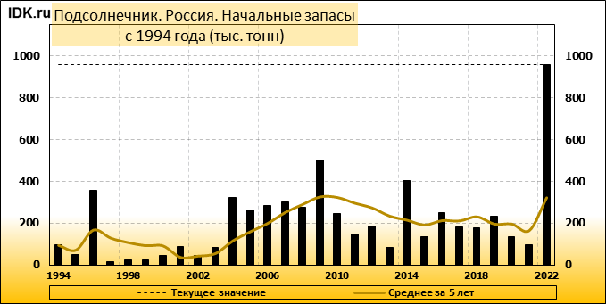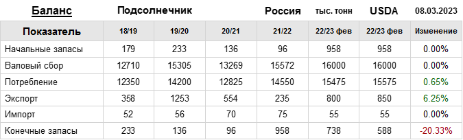 За прошедший месяц министерство сельского хозяйства США (USDA) на 08.03.2023 пересмотрело Баланс подсолнечника для России в сезоне 22/23 следующим образом: