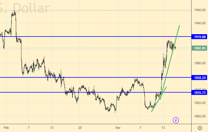 Если ФРС под давлением сложившихся обстоятельств в банковском секторе прекратит повышение ставки, или более того, начнет её снижение, то это приведет к продолжению роста цен на золото. Если будет откат к 1860, то им можно будет воспользоваться для входа в лонг.