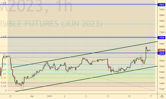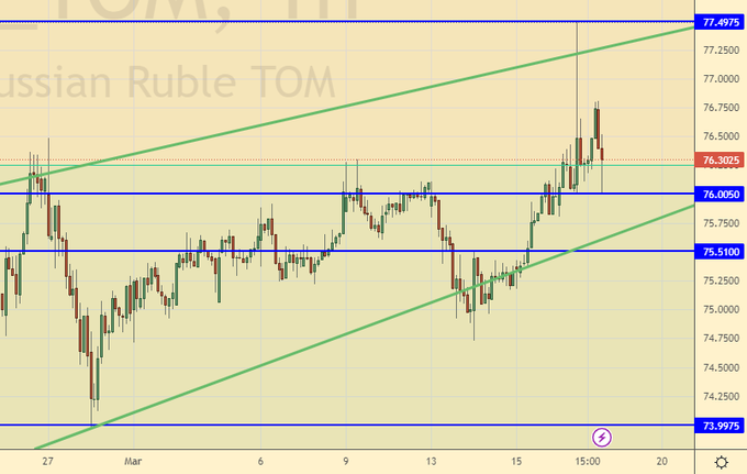 Если котировки закрепятся выше 76.50, то это приведет к созданию фундамента, на котором можно расти к 80.00 и выше. Глобально проблема в том, что для покрытия дефицита бюджета надо печатать рубли, или создавать новые производства, которые будут давать прибыль, но для этого в начале тоже надо печатать рубли. Если Набиуллина будет довольна тем, что происходит на валютном рынке, то тогда завтра мы не увидим повышения ставки, то есть она даже не попытается сделать национальную валюту несколько тяжелее.