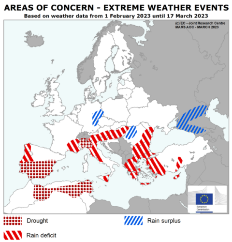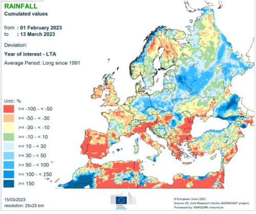 Серьезный дефицит дождей наблюдается на юге Испании и в Португалии. Уровень влажности почвы очень низок, и срочно необходимы дожди. Кроме того, водохранилища для орошения на большей части юга Испании остаются на очень низком уровне, что также может повлиять на выбор культур для весенних посевов. В северной и центральной Италии длительный дефицит осадков привел к резкому снижению уровня воды в водохранилищах (в том числе в виде снежного покрова в горах) и вызывает опасения по поводу наличия воды для орошения в конце весны и летом.