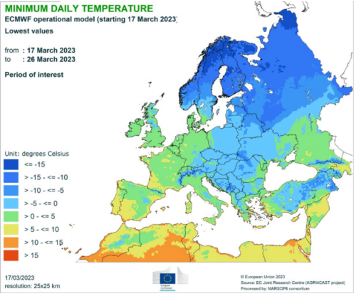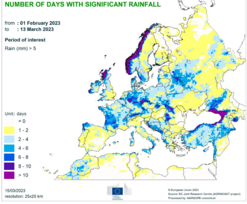 Согласно нашим моделям, за отчетный период не произошло существенного ущерба от мороза из-за преимущественно мягких температур. Незначительные повреждения могли быть нанесены в регионе Арагон в Испании, где с 27 февраля по 2 марта были сильные морозы. Тем не менее, эта территория не является объектом интенсивного сельскохозяйственного использования, и, таким образом, на национальном уровне не ожидается значительных потерь площади или урожайности.