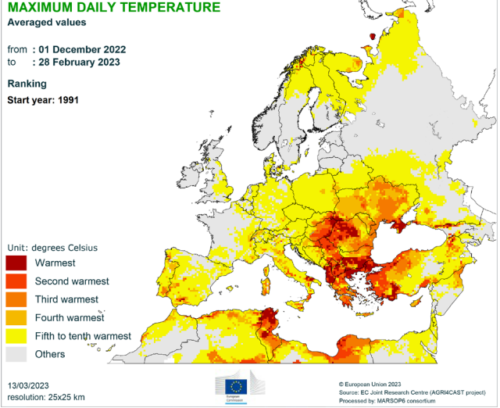 Почти во всех частях Европы наблюдались более теплые, чем обычно, условия по сравнению с долгосрочным средним значением (LTA) за 1991–2022 годы. Аномалии среднесуточной температуры по отношению к LTA варьировались от 2 °C до 4 °C выше LTA на большей части Балканского региона, в Венгрии, Словакии, Польше, Украине и некоторых частях Турции, а также в северной Скандинавии и европейской части России. Более отчетливые положительные температурные аномалии (до 6 °C выше LTA) локально наблюдались в Румынии и на самом севере европейской части России. Максимальные дневные температуры были одними из трех самых высоких за всю историю наблюдений с 1991 года на большей части Балканского региона, в западной части Турции и значительной части Украины, а также локально в Португалии, Испании и Италии. Количество холодных дней (с дневной минимальной температурой ниже 0 °C) было менее 40% по сравнению с LTA в некоторых частях Пиренейского полуострова, больших частях Италии и небольших частях юго-восточной Европы и Турции. Количество сильных похолоданий (с дневной минимальной температурой ниже -8 °C) составляло менее 40% от LTA на значительной части западной, центральной и юго-восточной Европы, в некоторых частях Турции и на западе Украины.