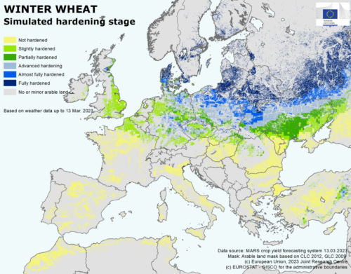 После благоприятных условий для закаливания в первой декаде февраля в течение рассматриваемого периода преобладали температуры выше среднего, что привело к ослаблению процесса закаливания на значительной части Европы. По состоянию на 13 марта в южной Европе и в Черноморском регионе (Болгария, восточная Румыния, южная Украина и юго-западная Россия) озимые зерновые полностью окрепли, что примерно на 2-3 недели раньше, чем в прошлом году. В западных частях центральной Европы озимые зерновые преимущественно слабо или частично закалены, в то время как моделирование стадии закаливания в самых северных регионах позволяет предположить, что культуры по-прежнему обладают хорошей морозостойкостью.
