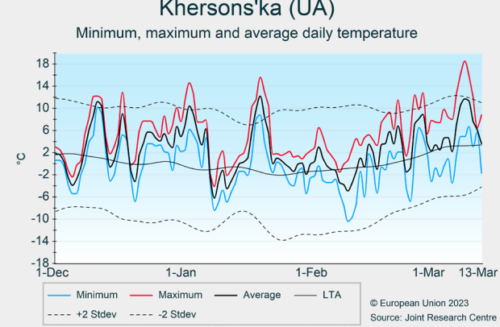 С декабря 2022 г. по февраль 2023 г. преобладали исключительно более теплые, чем обычно, условия. В восточных областях среднесуточные температуры были на 1–2 °C выше LTA. В центральной и западной областях наблюдалась положительная аномалия до 4 °С. Таким образом, озимые пережили зиму без каких-либо сильных похолоданий.