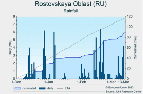 Прогнозы погоды до 23 марта предполагают, что температуры по всей Европе будут оставаться выше среднего, что еще больше ускорит размораживание. Это повысит уязвимость озимых зерновых в случае поздних холодов, которые, однако, в настоящее время не прогнозируются.