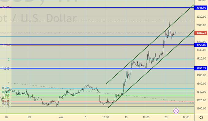 Пробили уровень 2000.0. Не исключено, что после роста выше 2050.0 на рынок придет толпа, так как о росте золота будут говорить неспециализированные интернет-издания. Неспособность экономики предложить инструмент, гарантирующий сохранение денег в период высокой инфляции, будет подталкивать к покупке золота на откатах.