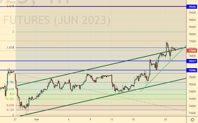 Покупка: при подходе к 75900. Стоп: 74900. Цель: 79500.