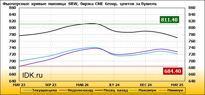 На 20.03.2023 стоимость пшеницы SRW на бирже CME Group по контракту MAY 23 составила 700.6 цента за бушель. За прошедшую неделю стоимость пшеницы SRW выросла на 16.2 цента/бушель. Как мы видим на графике, фьючерсная кривая имеет периоды, когда более дальний фьючерс дешевле ближнего. Состояние бэквардации наблюдаем на следующих контрактах: JLY 24; SEP 24; MAY 25. Таким образом, трейдеры предполагают, что возможно превалирование предложения над спросом в указанные периоды.