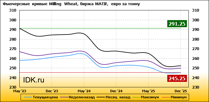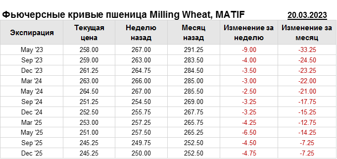 На 20.03.2023 стоимость пшеницы Milling Wheat на бирже MATIF по контракту May ’23 составила 258 евро за тонну. За прошедшую неделю стоимость пшеницы Milling Wheat упала на 9 евро/тонна. Как мы видим на графике, фьючерсная кривая имеет периоды, когда более дальний фьючерс дешевле ближнего. Состояние бэквардации наблюдаем на следующих контрактах: Sep ’24; May ’25; Sep ’25. Таким образом, трейдеры предполагают, что возможно превалирование предложения над спросом в указанные периоды.