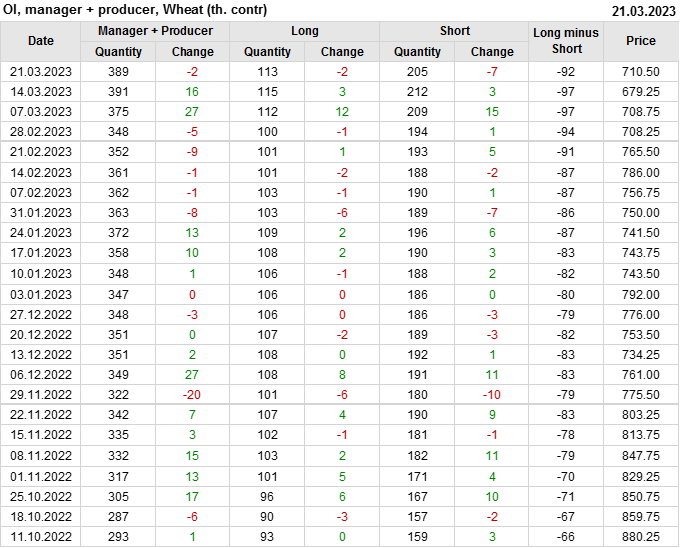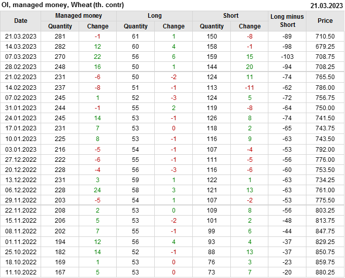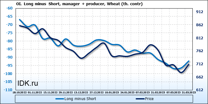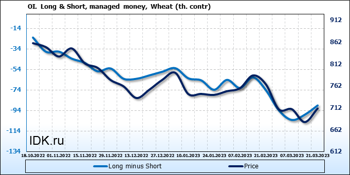 За прошедшую неделю, 15.03.23 — 21.03.23, разница между длинными и короткими позициями управляющих сократилась на 9 тыс. контрактов. В тоже время, цена выросла на 31.25 цента.