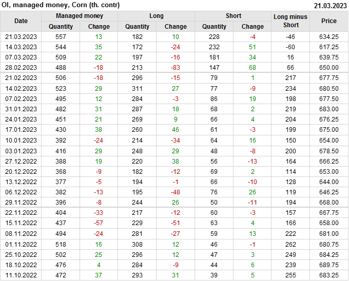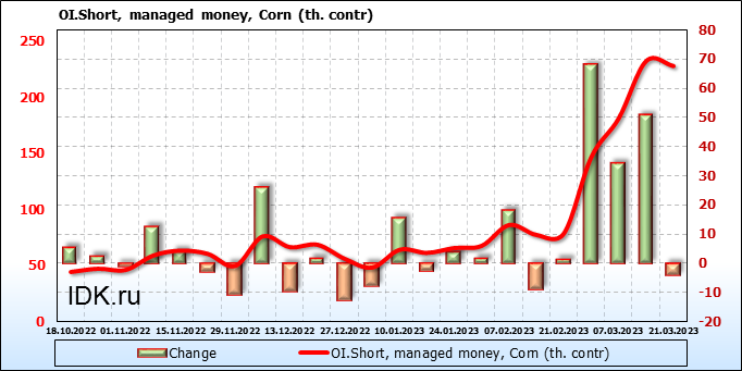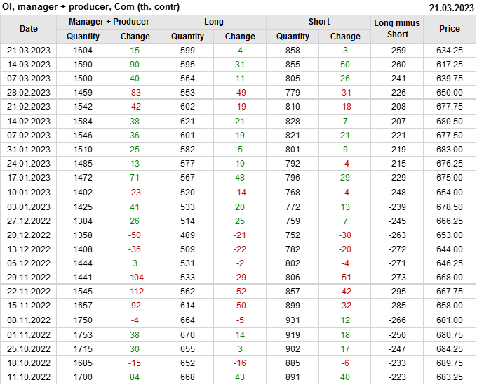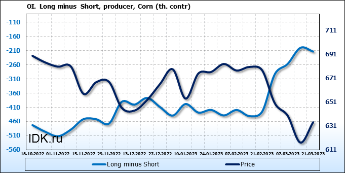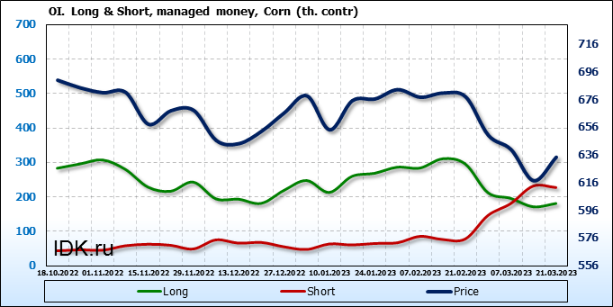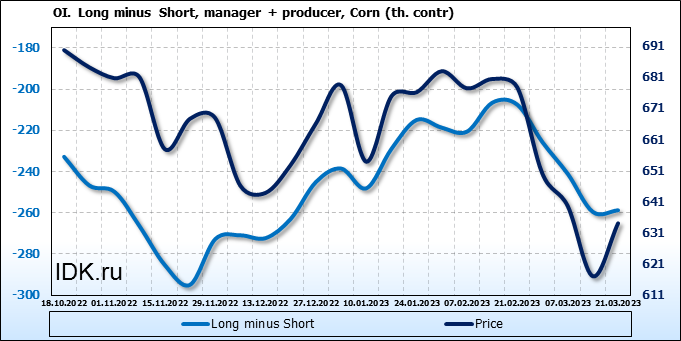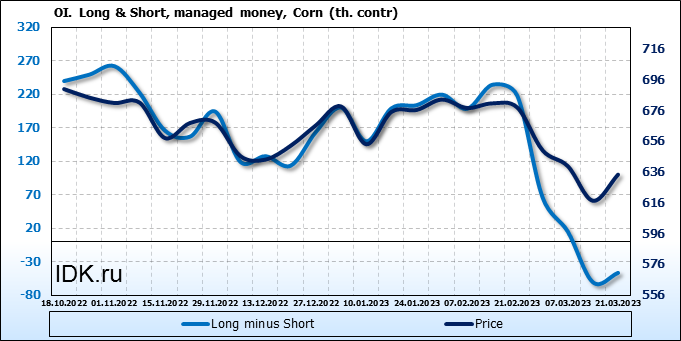 За прошлую неделю, 15.03.23 — 21.03.23, разница между длинными и короткими позициями управляющих сократилась на 14 тыс. контрактов. В тоже время, цена выросла на 17 центов.