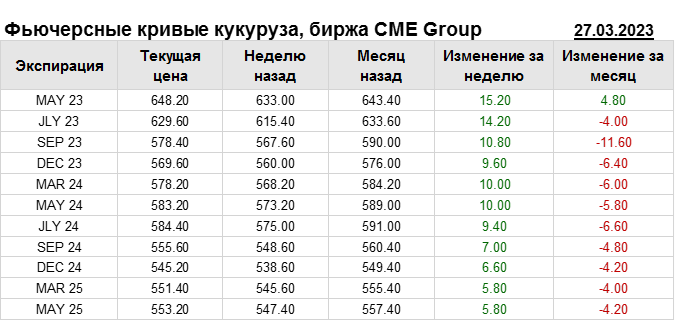 На 27.03.2023 стоимость кукурузы на бирже CME Group по контракту MAY 23 составила 648.2 цента за бушель. За прошедшую неделю стоимость кукурузы на площадке CME Group выросла на 15.2 цента/бушель. Как мы видим на графике, фьючерсная кривая имеет периоды, когда более дальний фьючерс дешевле ближнего. Состояние бэквардации наблюдаем на следующих контрактах: JLY 23; SEP 23; DEC 23; SEP 24; DEC 24. Таким образом, трейдеры предполагают, что возможно превалирование предложения над спросом в указанные периоды.