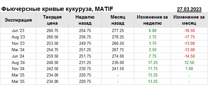 На 27.03.2023 стоимость кукурузы на бирже MATIF по контракту Jun ’23 составила 260.75 евро за тонну. За прошедшую неделю стоимость кукурузы на европейской площадке выросла на 6 евро/тонна. Как мы видим на графике, фьючерсная кривая имеет периоды, когда более дальний фьючерс дешевле ближнего. Состояние бэквардации наблюдаем на следующих контрактах: Aug ’23; Nov ’23; Aug ’24; Nov ’24; Mar ’25. Таким образом, трейдеры предполагают, что возможно превалирование предложения над спросом в указанные периоды.