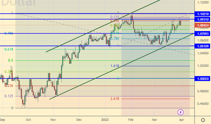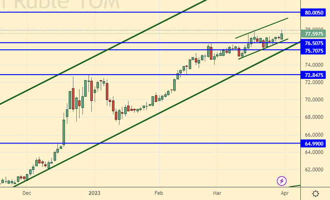 Сценарий роста: рассматриваем апрельский фьючерс, дата экспирации 28 апреля. Цель на 79.00 достигнута. Желающие могут оставить покупки от 70.10 в расчете на достижение нашей дальней цели на 110.00, при этом стоит агрессивно подтянуть стоп-ордера.