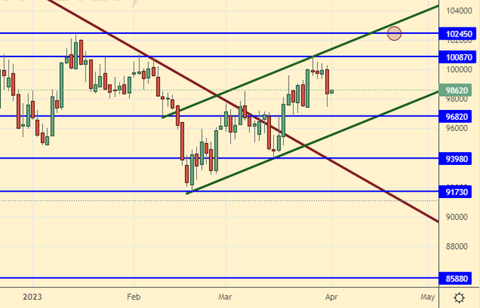 Сценарий падения: пока мы ниже 102000 любые сигналы разворота вниз надо отрабатывать. Здесь можно войти в шорт.