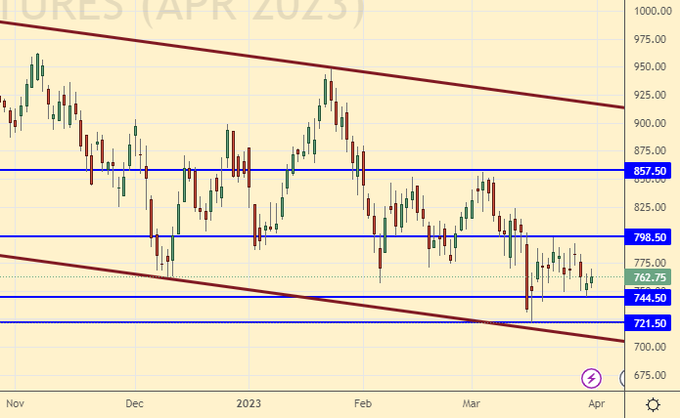 Сценарий роста: рассматриваем майский фьючерс, дата экспирации 12 мая. Сместим цель на 765.0. Движение вверх остается для нас основным. У быков есть весь апрель чтобы поднять цены. А вот дальше сделать это будет невозможно, начнется сезон.