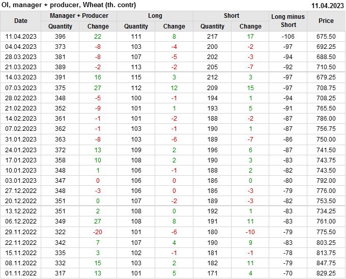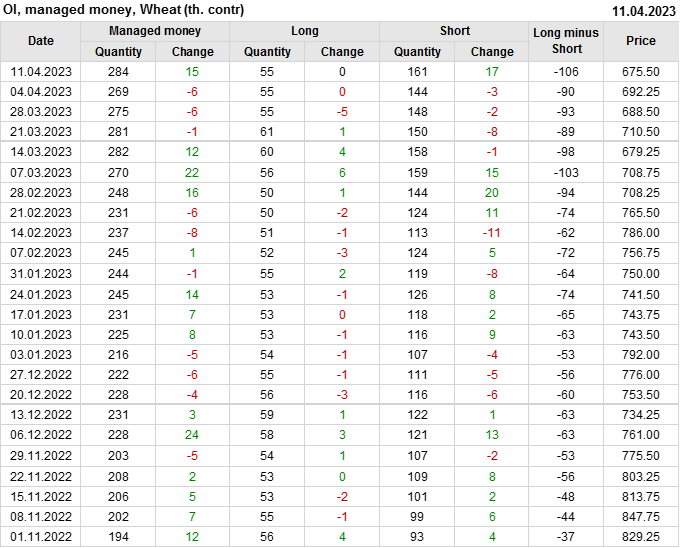 За прошедшую неделю, 05.04.23 — 11.04.23, разница между длинными и короткими позициями управляющих увеличилась на 16.6 тыс. контрактов. В тоже время, цена упала на 16.75 цента.
