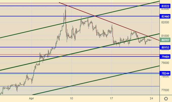 Продажа: нет. Кто в позиции от 82.50 и 82.00, держите стоп на 82.60. Цель: 78.00.