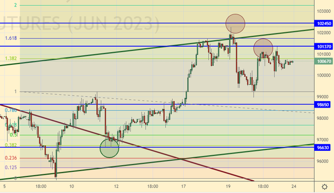 Сбербанк объявил дивиденды в размере 25 рублей. Всё, собрание акционеров утвердило, все молодцы. Теперь мы скорее всего увидим откат. Если при этом и рубль нас ничем не порадует, то нас ждет очередное снижение индекса РТС. Только после роста выше 103000 у быков появится шанс.