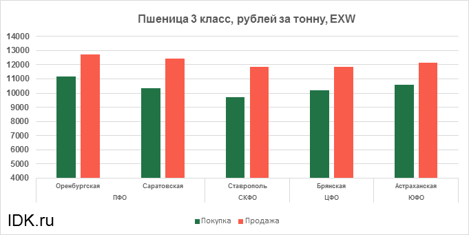 За прошедшую неделю с 17.04.2023 по 21.04.2023 средняя цена на пшеницу 4-го класса, согласно выставленным заявкам трейдеров, упала по всем округам на 63 рубля. Средняя цена составляет 10016 рублей за тонну.