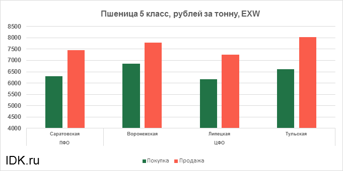 За прошедшую неделю с 17.04.2023 по 21.04.2023 средняя цена на пшеницу 5-го класса, согласно выставленным заявкам трейдеров, упала по всем округам на 521 рубль. Средняя цена составляет 7013 рублей за тонну.