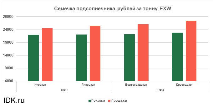 За прошедшую неделю с 17.04.2023 по 21.04.2023 средняя цена семечки подсолнечника, согласно выставленным заявкам трейдеров, упала по всем округам на 1303 рубля. Средняя цена составляет 24050 рублей за тонну.