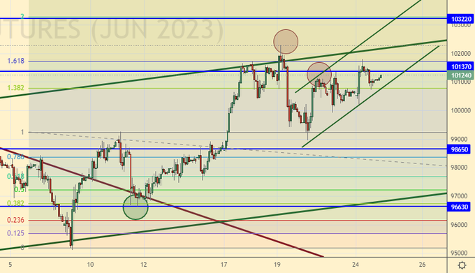 Пытаемся обозначить движение вверх. Смущает только вчерашний сброс на Газпроме, сразу на 4 млрд. рублей, что обвалило рынок на моменте. Или это ошибка, или кто-то что-то знает. Такое событие явно заслуживает внимание регулятора. Выйдем выше 103000 будем думать о покупках.