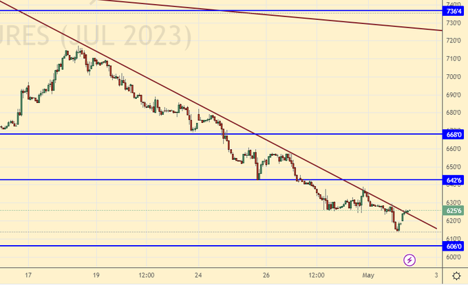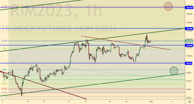 Пока рынку удавалось найти оптимизм. Не исключено, что позитивная картинка привлечет на биржу большее количество денег, тем более что им больше некуда бежать. Перспективы хода вверх к 106000 и 112000 сохраняются. В случае неспособности пройти выше 103000 возможен резкий удар вниз.
