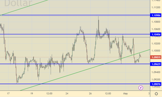 Евро не так силен, как это представлялось ранее. Ждем заседания ФРС 3-го мая. Сегодня можно остаться вне рынка, так как никаких сильных движений скорее всего не будет. Падение ниже 1.1000 создало предпосылку для хода в район 1.0700.
