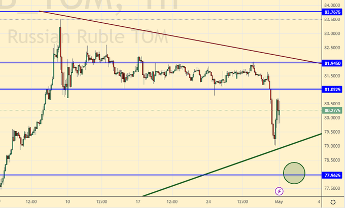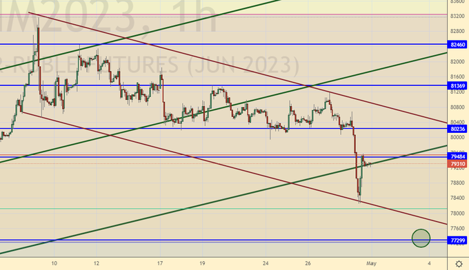 Возможно продолжение укрепления рубля до 78.00. Отметим, что в случае прекращения импорта в страну большинства товаров потребность в долларе на первом этапе резко снизится, но затем, по мере роста потребности в новых материальных благах, его курс будет расти не напрямую, а через падение рубля к юаню и рупии. Но это произойдет не завтра.