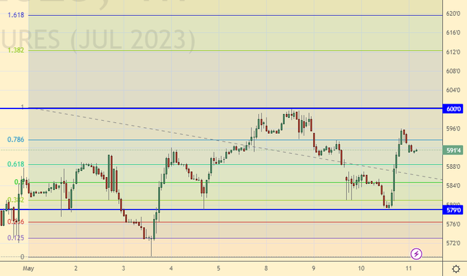 Продолжим сохранять бычий настрой. Мы способны пройти к 620.0. Не исключено, что завтра вечером, после выхода данных USDA, волатильность резко вырастет. Сохраняем концентрацию.