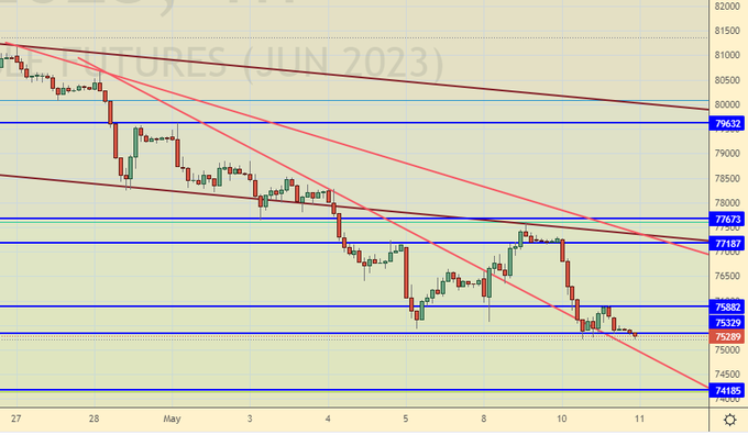 Продажа: нет. Кто в позиции от 77500, перенесите стоп на 77400. Цель: 74200.