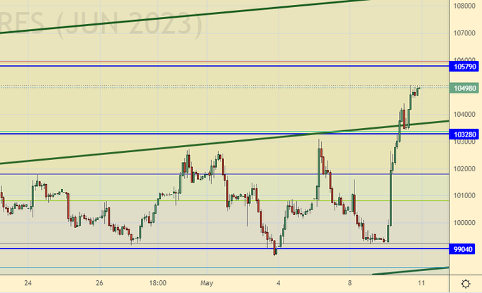 Выросли выше 101000, вы должны были войти в лонг. Если мы сможем пройти выше 106000, то нас ждет ход на 112000. Если рубль пойдет на 103000, то такой сценарий вполне возможен.