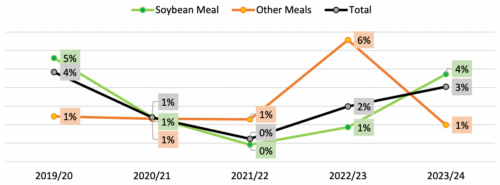 Прогнозируется, что мировое потребление соевого шрота вырастет на 4 процента в 2023/24 году при наличии достаточных запасов по сравнению с прогнозом роста на 1 процент на этот год. Ожидается, что на Китай будет приходиться почти треть роста мирового потребления после нескольких лет относительно неизменного потребления соевого шрота. Экспорт, по прогнозам, вырастет на 6 процентов благодаря восстановлению производства сои в Аргентине после улучшения перспектив производства сои и увеличения поставок в США и Бразилии. Прогнозируется, что доля Аргентины в мировой торговле вырастет в 2023–2024 годах, но останется значительно ниже среднего показателя за 5 лет из-за усиления конкуренции со стороны Бразилии и США.
