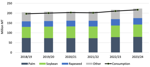 Прогнозируется, что мировое потребление вырастет на 6,7 млн тонн, то есть почти на 3%, в основном за счет роста производства пальмового и соевого масла. Прогнозируется, что в натуральном выражении потребление продовольствия вырастет больше, чем промышленное потребление, однако темпы роста промышленного потребления, как ожидается, снова будут опережать рост потребления продовольствия. Прогнозируется, что промышленное потребление соевого масла увеличится в США, Бразилии и Аргентине, а использование пальмового масла, как ожидается, возрастет в Индонезии, Малайзии и Китае.
