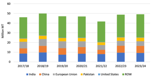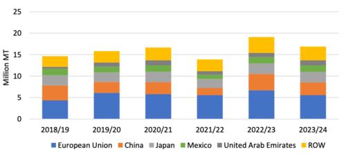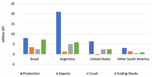 Прогнозируется, что экспорт сои из Бразилии составит рекордные 96,5 млн тонн, что составит 56% мировой торговли, в то время как прогнозируется, что экспорт США снизится до 53,7 млн и оставит Соединенным Штатам 31-процентную долю рынка. Прогнозируется, что Китай будет импортировать 100,0 млн тонн соевых бобов, в то время как остальной мир составит около 70,0 млн, при этом импорт ЕС будет относительно неизменным на уровне 14,0 млн тонн. Более слабый рост импорта сои в Китае и ЕС можно объяснить ростом внутреннего производства сои, рапса и подсолнечника в обеих странах, а также сохраняющимся высоким спросом на импортные семена рапса и подсолнечника и продукты.