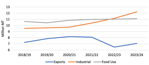 Прогнозируется, что потребление соевого масла вырастет на 5 процентов благодаря росту спроса на продукты питания в Китае и более высокому промышленному потреблению в США и Бразилии. Прогнозируется, что мировой экспорт вырастет на 8 процентов в 2023/24 году благодаря восстановлению производства в Аргентине, но останется ниже прежнего уровня из-за роста промышленного потребления в странах-экспортерах.