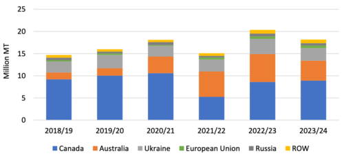 Ожидается, что глобальный переходящий остаток будет немного восстанавливаться из года в год, особенно в Канаде и ЕС, и достигнет среднего уровня за 5 лет. Прогнозируется, что мировой экспорт значительно сократится из-за сокращения производства в Австралии. Экспорт из Канады, по прогнозам, немного увеличится, поскольку спрос на импорт в Китае снижается из-за увеличения внутреннего производства рапса, а также растущего спроса на другие семена масличных культур и продукты. Прогнозируется, что мировое производство рапса достигнет рекордных 81,0 млн тонн с ростом в Европейском союзе, Канаде и Китае.